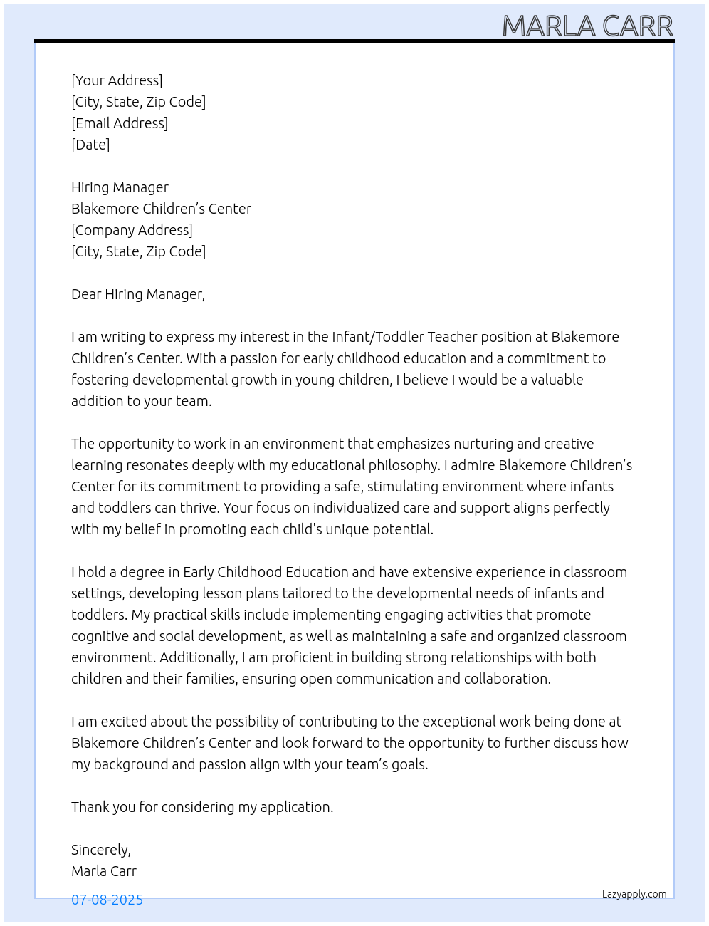 Infant/Toddler Teacher Cover Letter At Blakemore Children’s Center