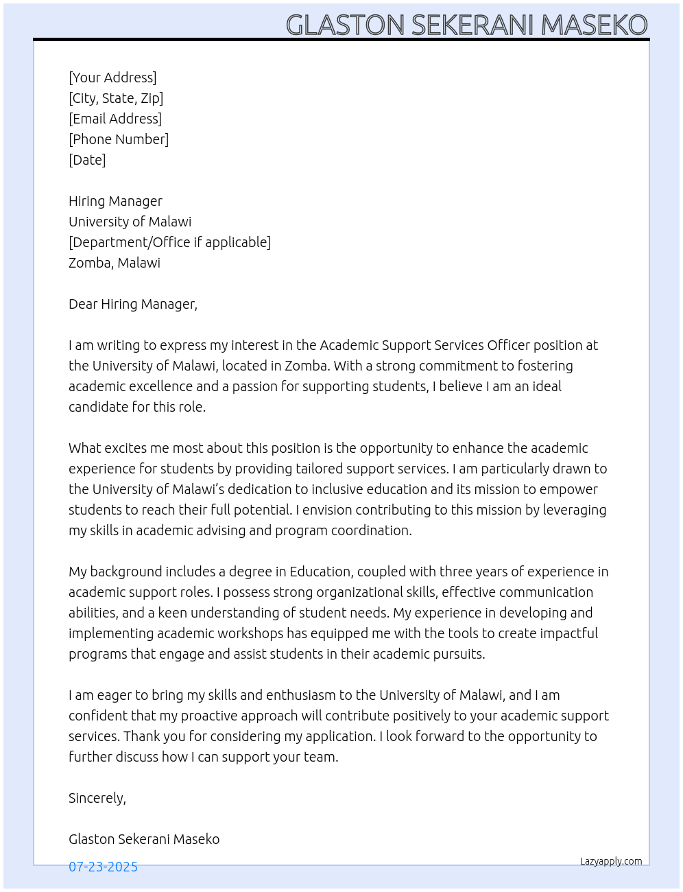 Academic support services officer Cover Letter At University of Malawi