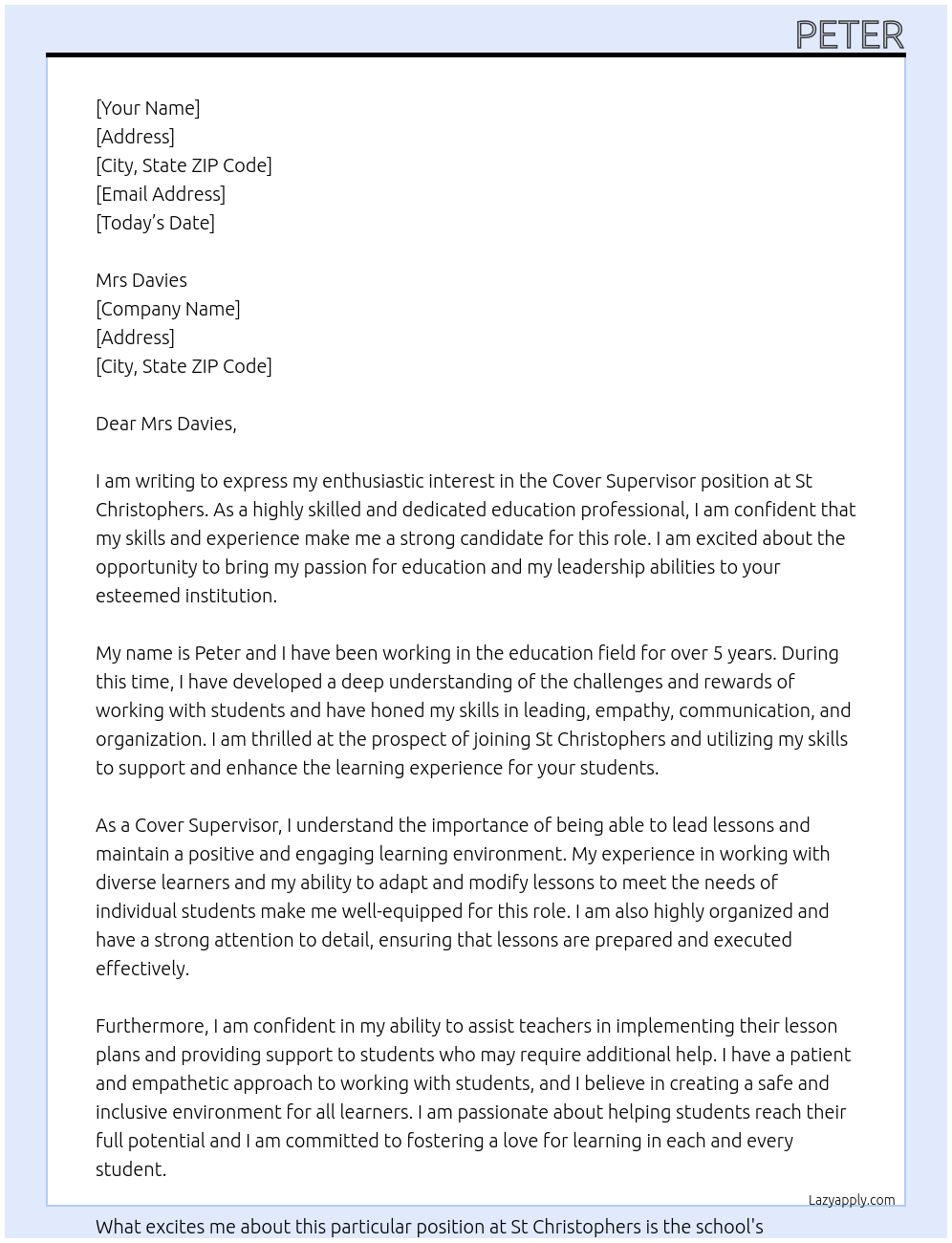 Check out these cover supervisor cover letter sample and examples previously used by job seekers to land on job interviews as cover supervisor. Use our AI cover letter generator to create a personalized cover letter as cover supervisor.