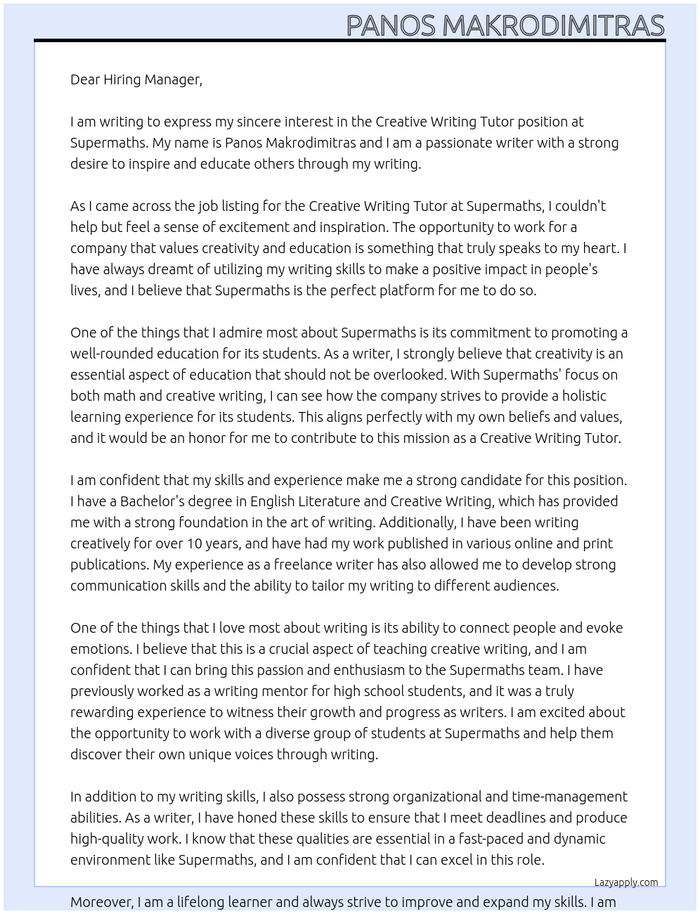 Check out these creative writing tutor cover letter sample and examples previously used by job seekers to land on job interviews as creative writing tutor. Use our AI cover letter generator to create a personalized cover letter as creative writing tutor.
