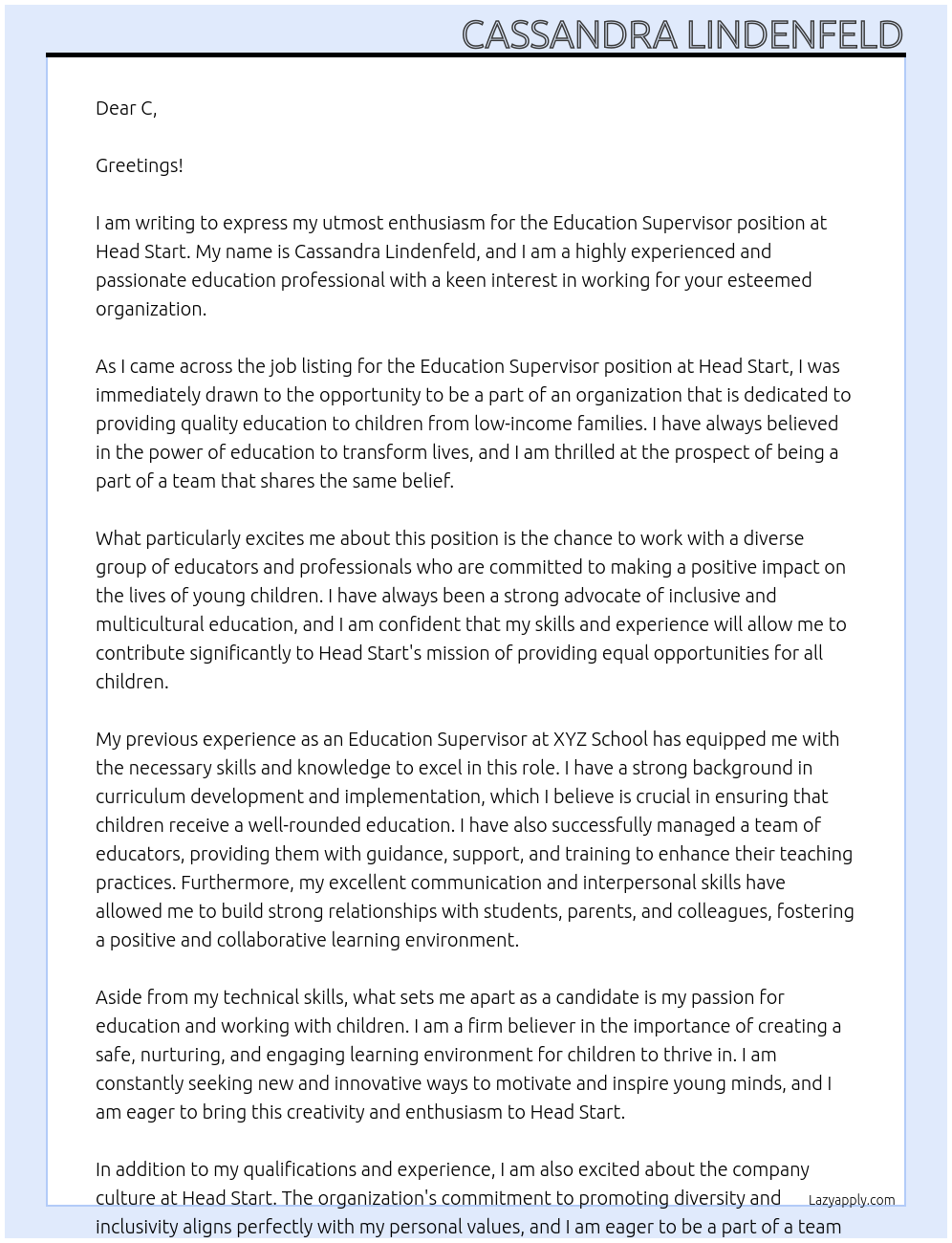 Check out these education supervisor cover letter sample and examples previously used by job seekers to land on job interviews as education supervisor. Use our AI cover letter generator to create a personalized cover letter as education supervisor.