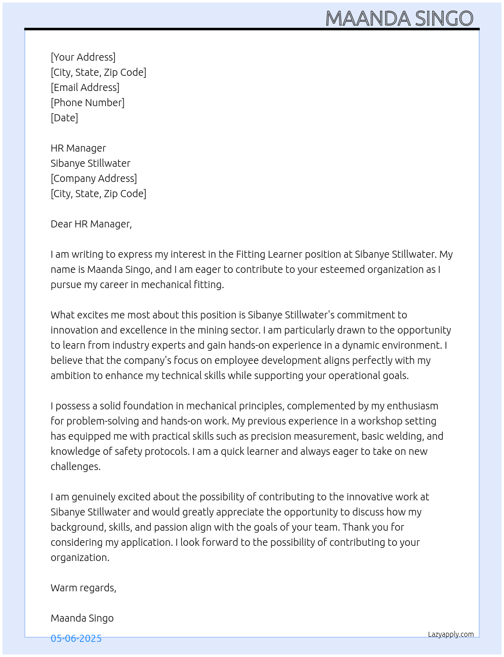 Fitting learner Cover Letter At Sibanye Stillwater