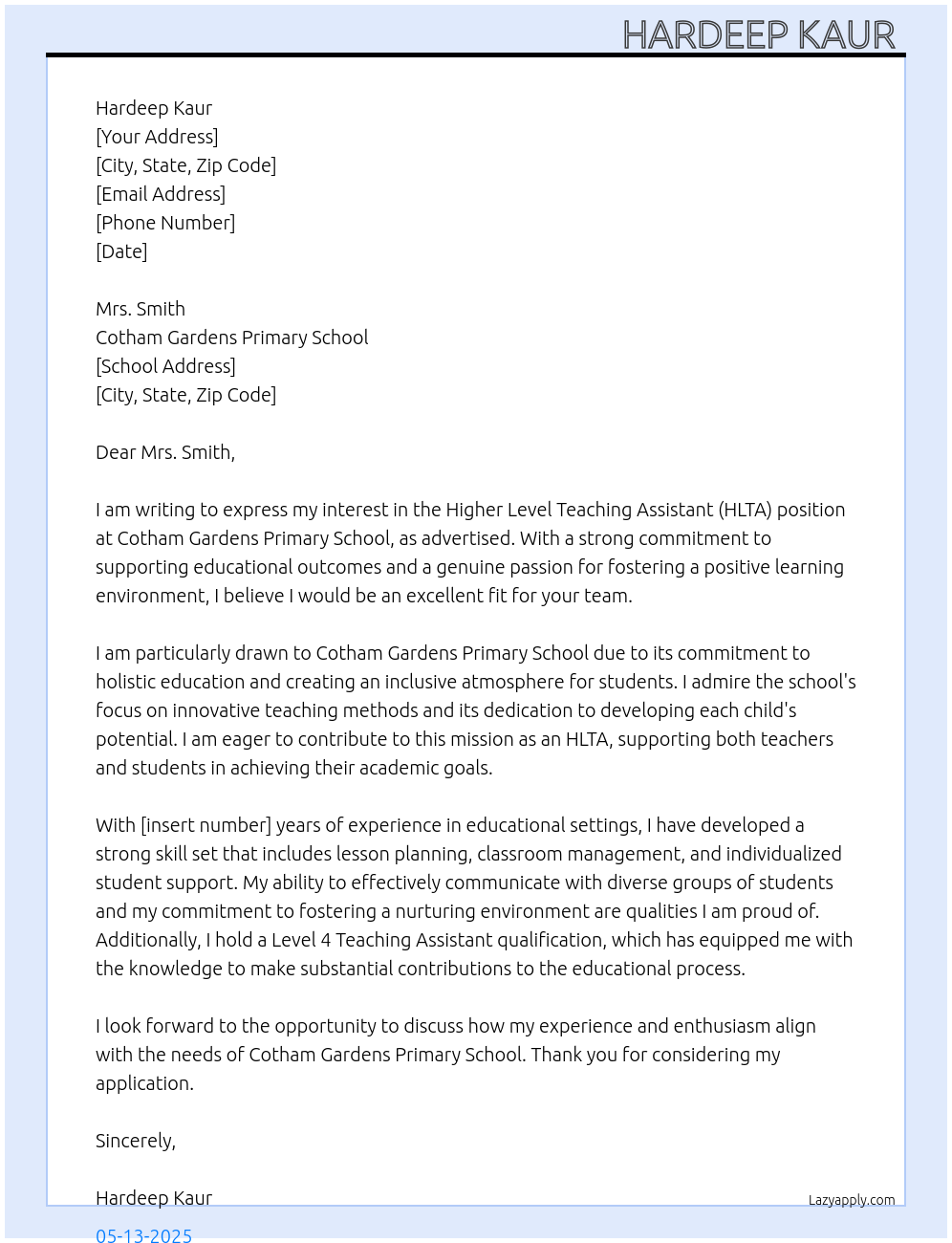 HLTA At Cotham Gardens Primary School  Cover Letter