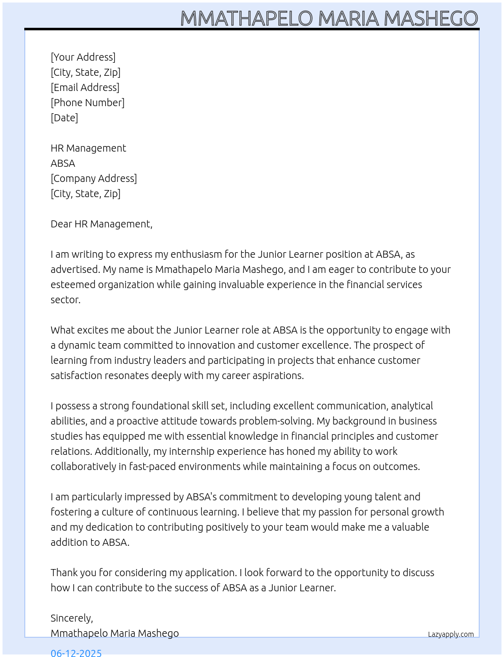 Junior learner Cover Letter At ABSA