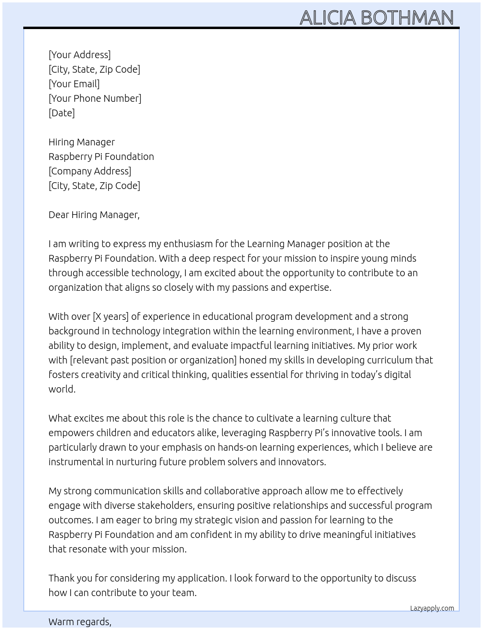Learning Manager Cover Letter At Raspberry Pi Foundation