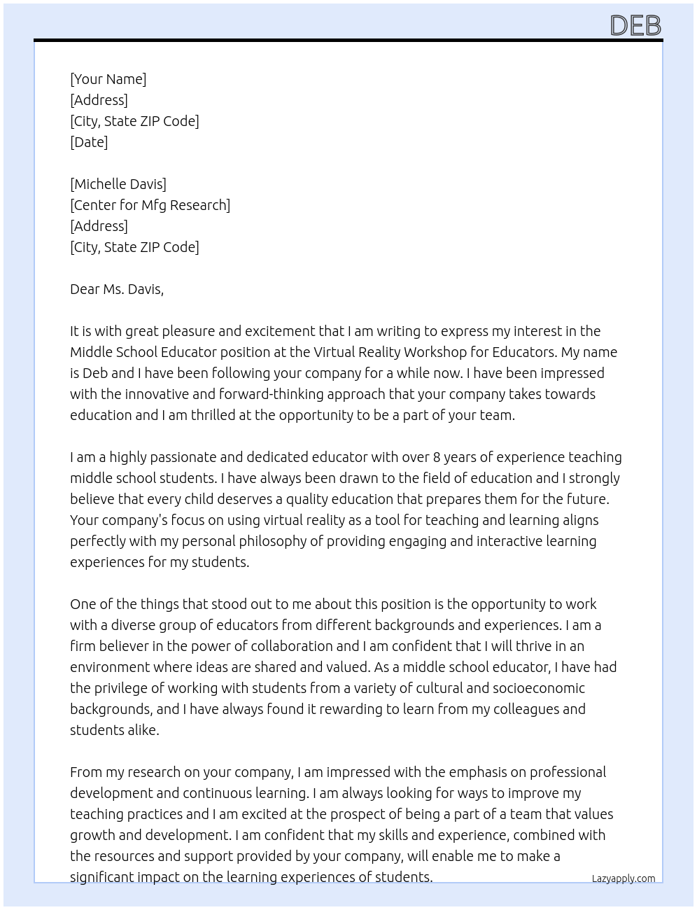 Middle School Educator Cover Letter At Virtual Reality Workshop for Educators