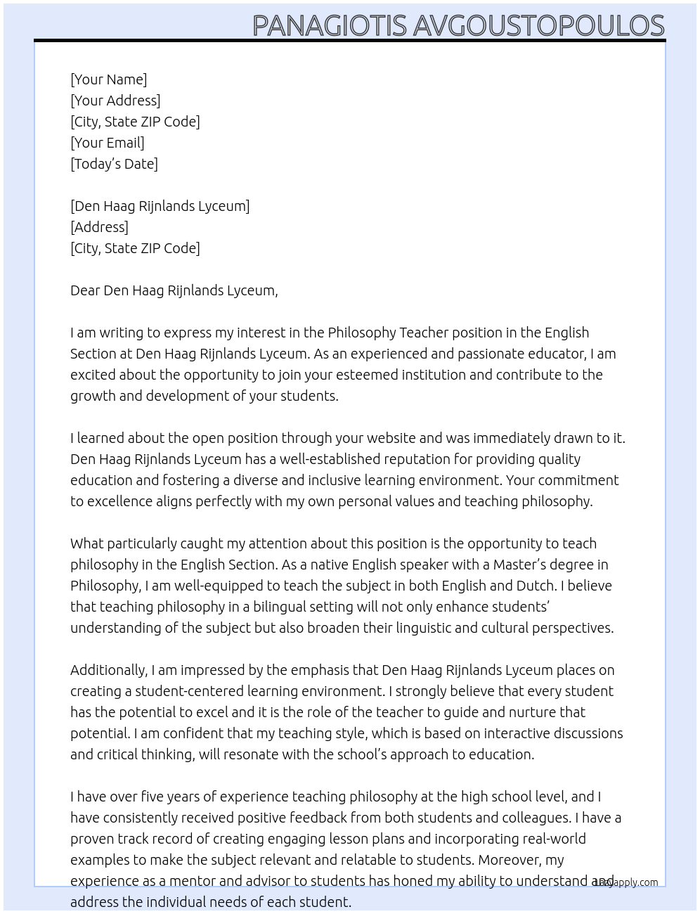 Philosophy Teacher in the English Section At Den Haag Rijnlands Lyceum Cover Letter