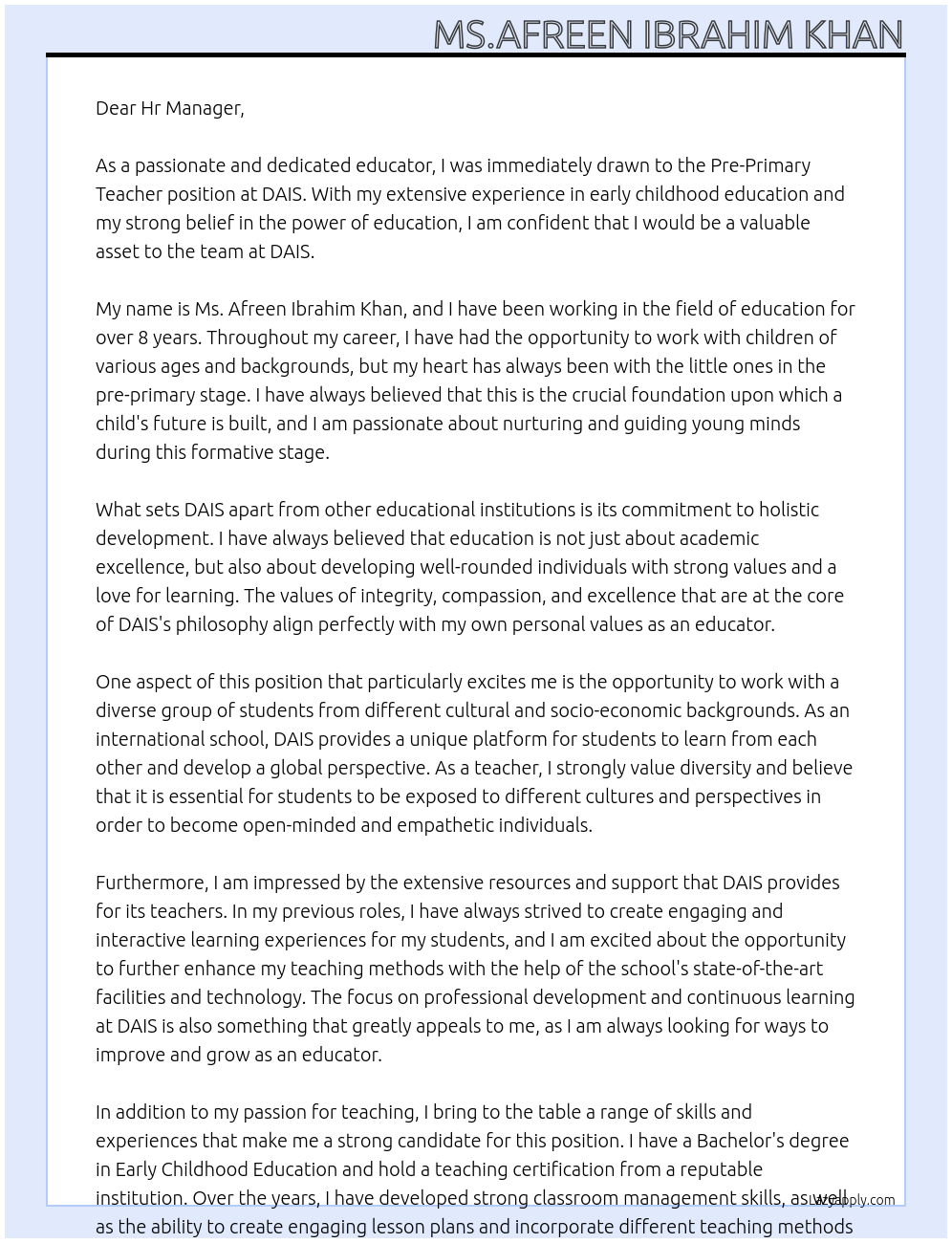 Check out these pre-primary teacher cover letter sample and examples previously used by job seekers to land on job interviews as pre-primary teacher. Use our AI cover letter generator to create a personalized cover letter as pre-primary teacher.
