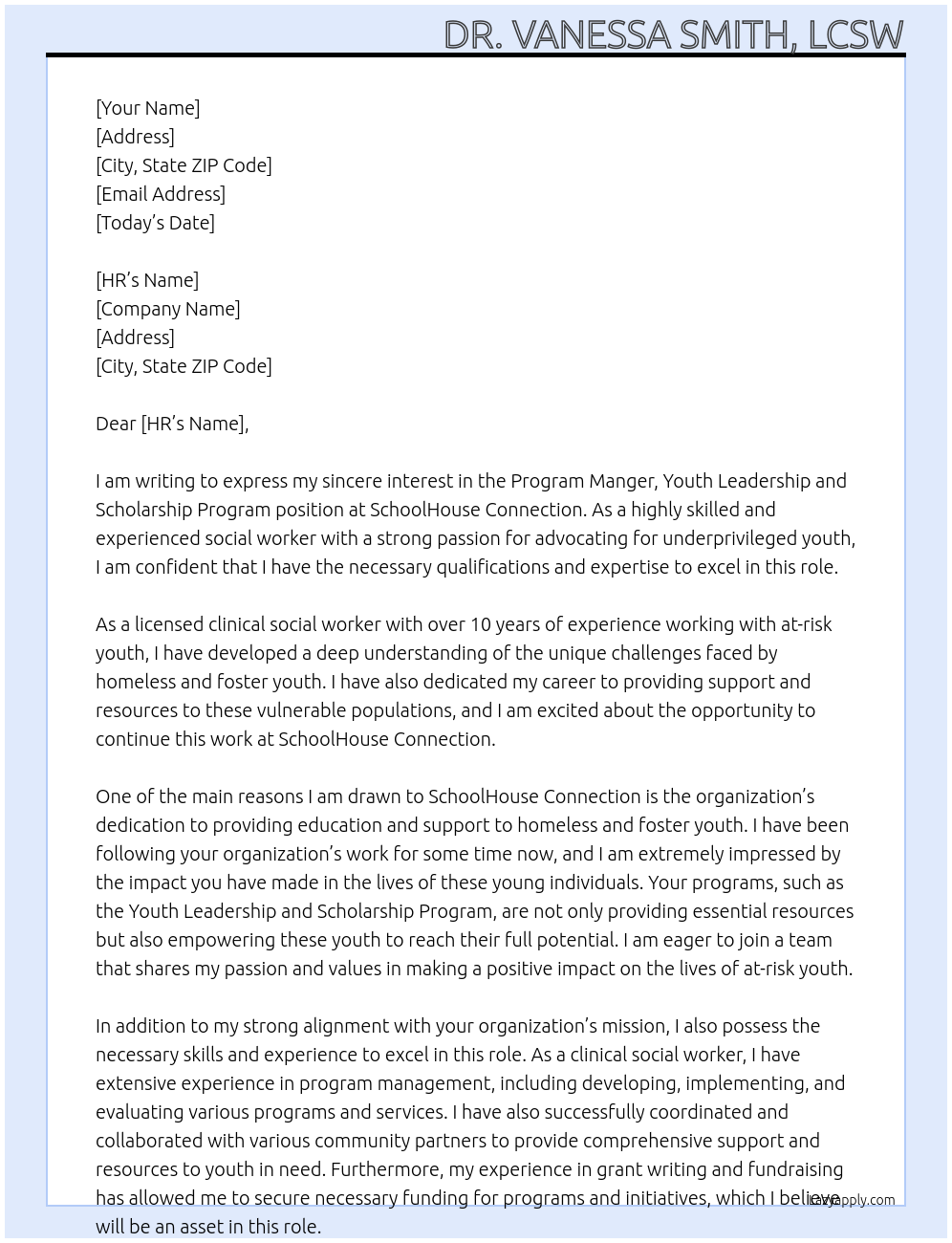 Program Manger, Youth Leadership and Scholarship Program Cover Letter At SchoolHouse Connection