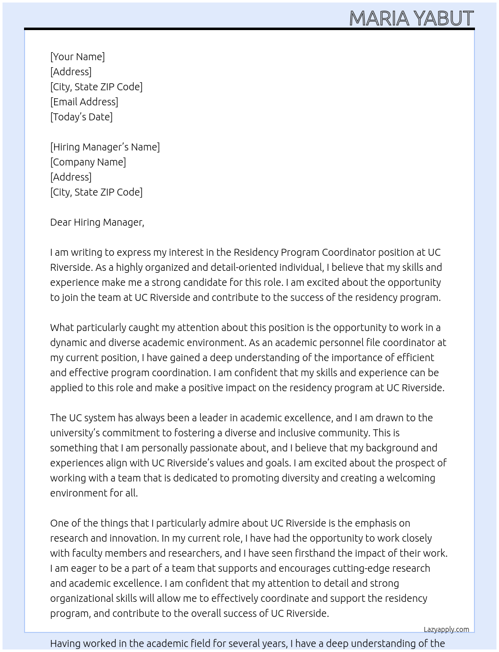 Residency Program CoordiAcademic Personnel File Coordinatornator Cover Letter At UC Riverside