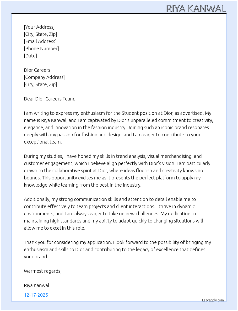 student At women@ Dior&UNESCO Education and Mentorship Cover Letter
