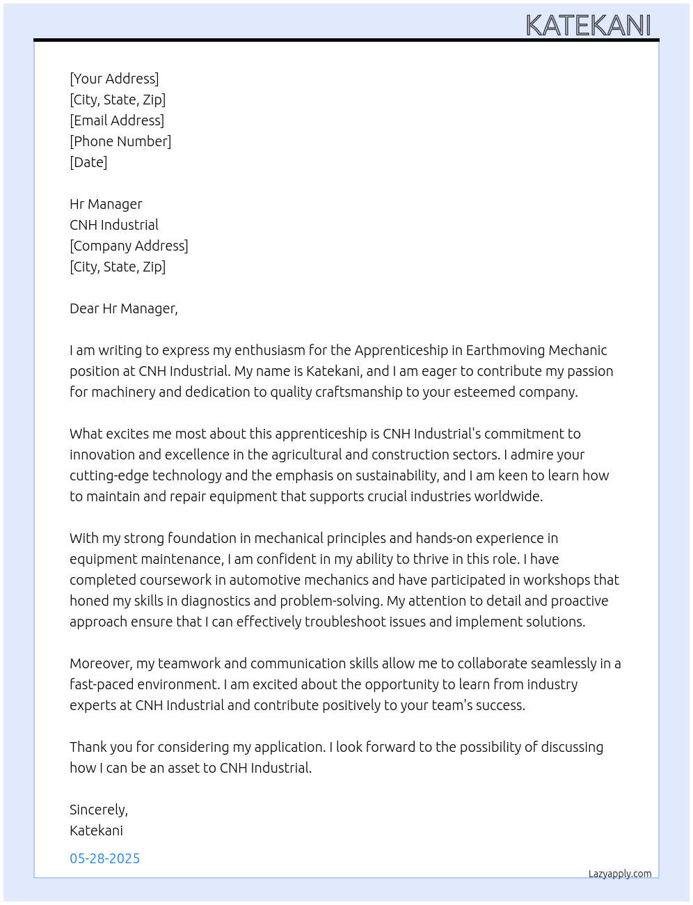 Check out these apprenticeship in earthmoving mechanic cover letter sample and examples previously used by job seekers to land on job interviews as apprenticeship in earthmoving mechanic. Use our AI cover letter generator to create a personalized cover letter as apprenticeship in earthmoving mechanic.