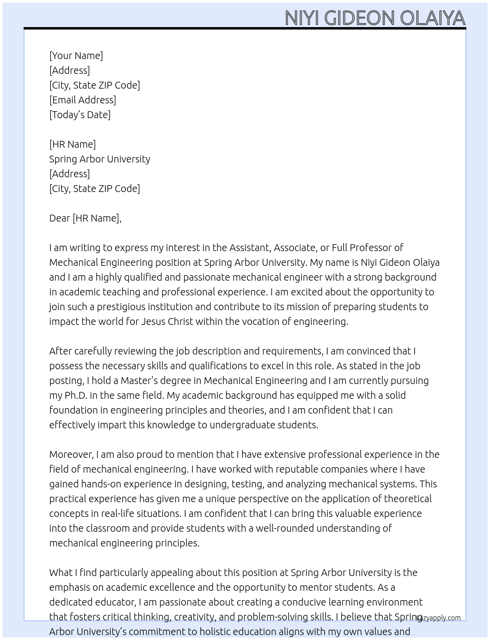 as is a successful record of teaching and mentoring undergraduate students. We are seeking individuals who are passionate about academic excellence and about preparing students to impact the world for Jesus Christ within the vocation of engineering. Spring Arbor University is regionally accredited by the Higher Learning Commission and is located on a beautiful campus in south central Michigan. Review of applications will begin upon receipt and will continue until the position is filled