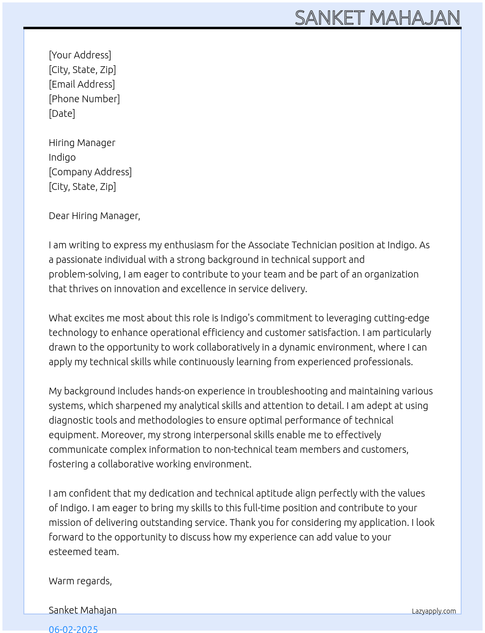 Check out these associate technician cover letter sample and examples previously used by job seekers to land on job interviews as associate technician. Use our AI cover letter generator to create a personalized cover letter as associate technician.