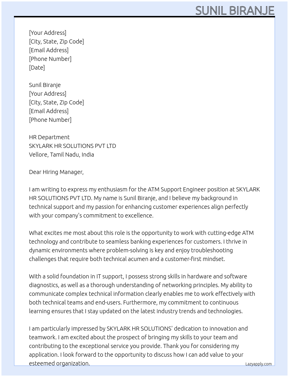 ATM support Engineer Cover Letter At SKYLARK HR SOLUTIONS PVT LTD SKYLARK HR SOLUTIONS Pvt Ltd Vellore, Tamil Nadu, India