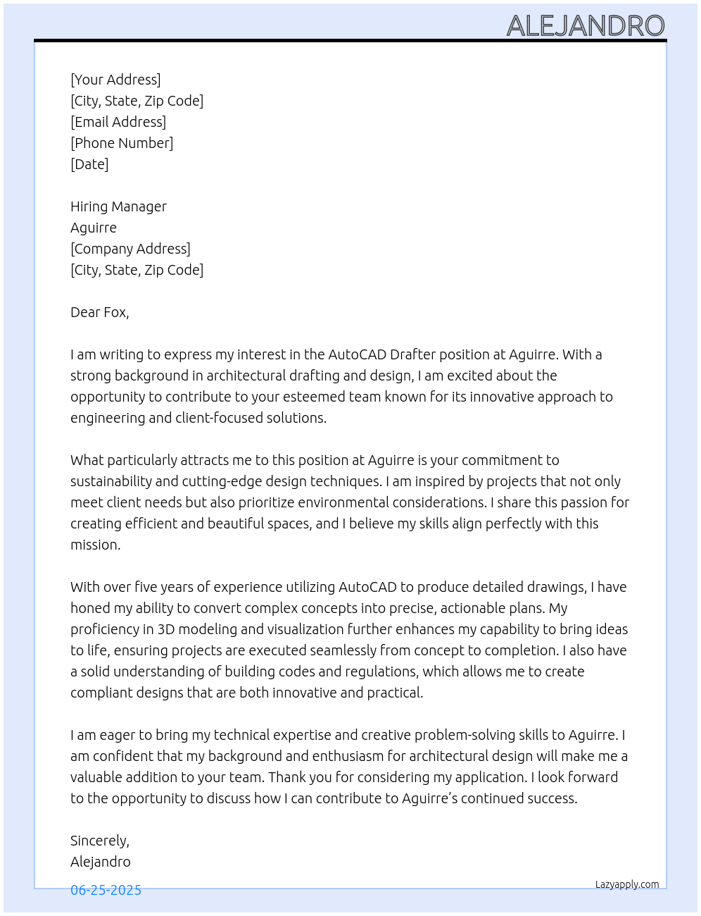 Check out these autocad drafter cover letter sample and examples previously used by job seekers to land on job interviews as autocad drafter. Use our AI cover letter generator to create a personalized cover letter as autocad drafter.
