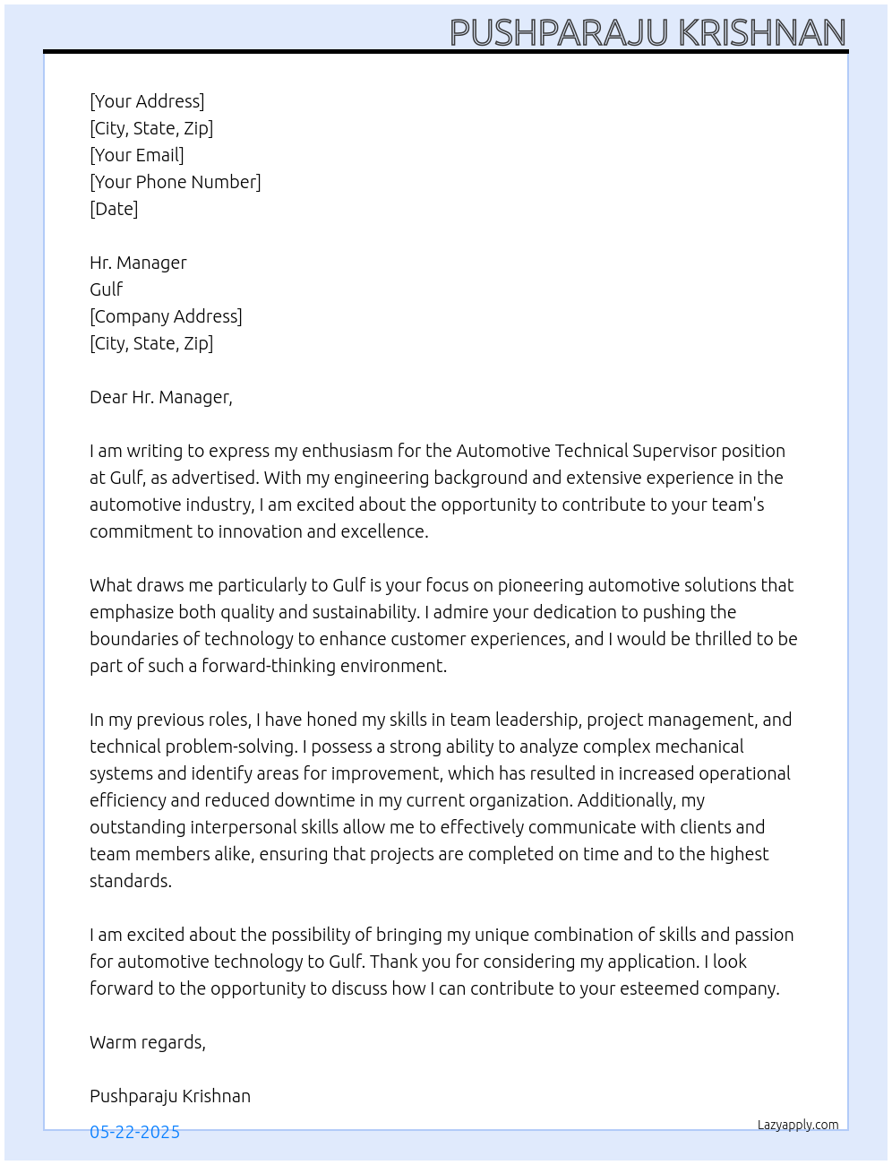 Check out these automotive technical supervisor cover letter sample and examples previously used by job seekers to land on job interviews as automotive technical supervisor. Use our AI cover letter generator to create a personalized cover letter as automotive technical supervisor.