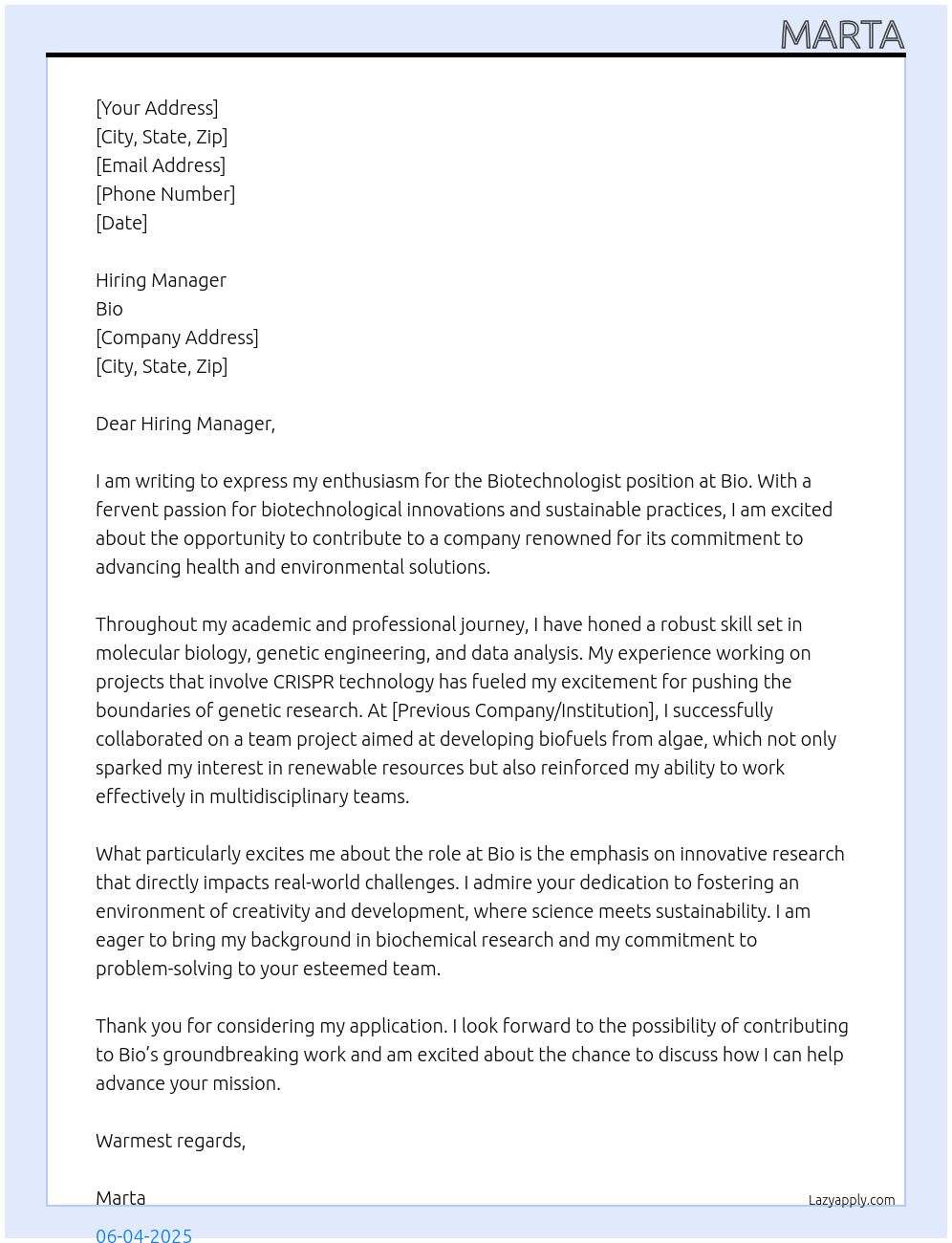 Check out these biotechnologist cover letter sample and examples previously used by job seekers to land on job interviews as biotechnologist. Use our AI cover letter generator to create a personalized cover letter as biotechnologist.