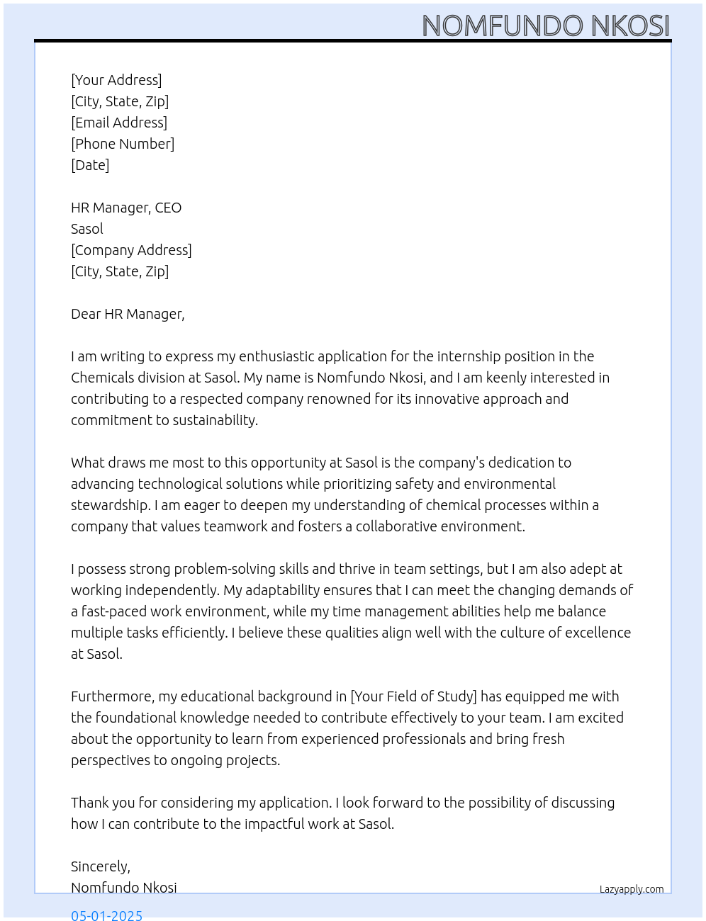 Chemicals Cover Letter At Sasol