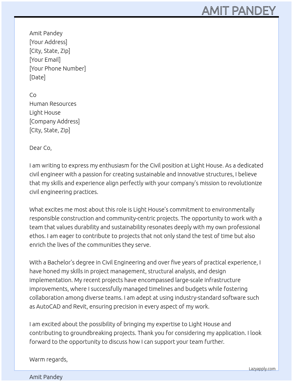 Check out these civil cover letter sample and examples previously used by job seekers to land on job interviews as civil. Use our AI cover letter generator to create a personalized cover letter as civil.