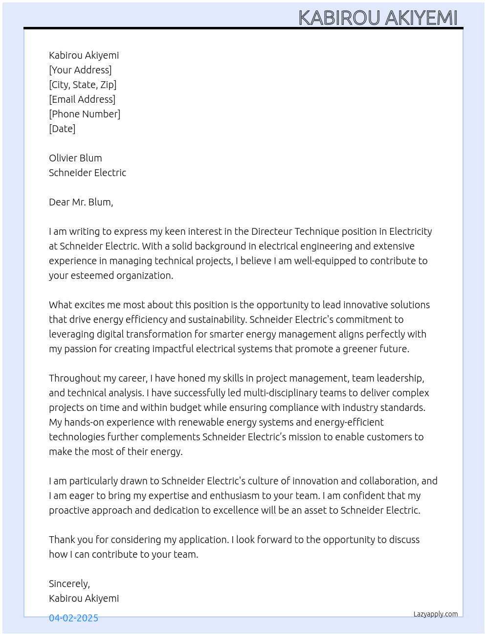 Directeur technic in electricity Cover Letter At Schneider Electric