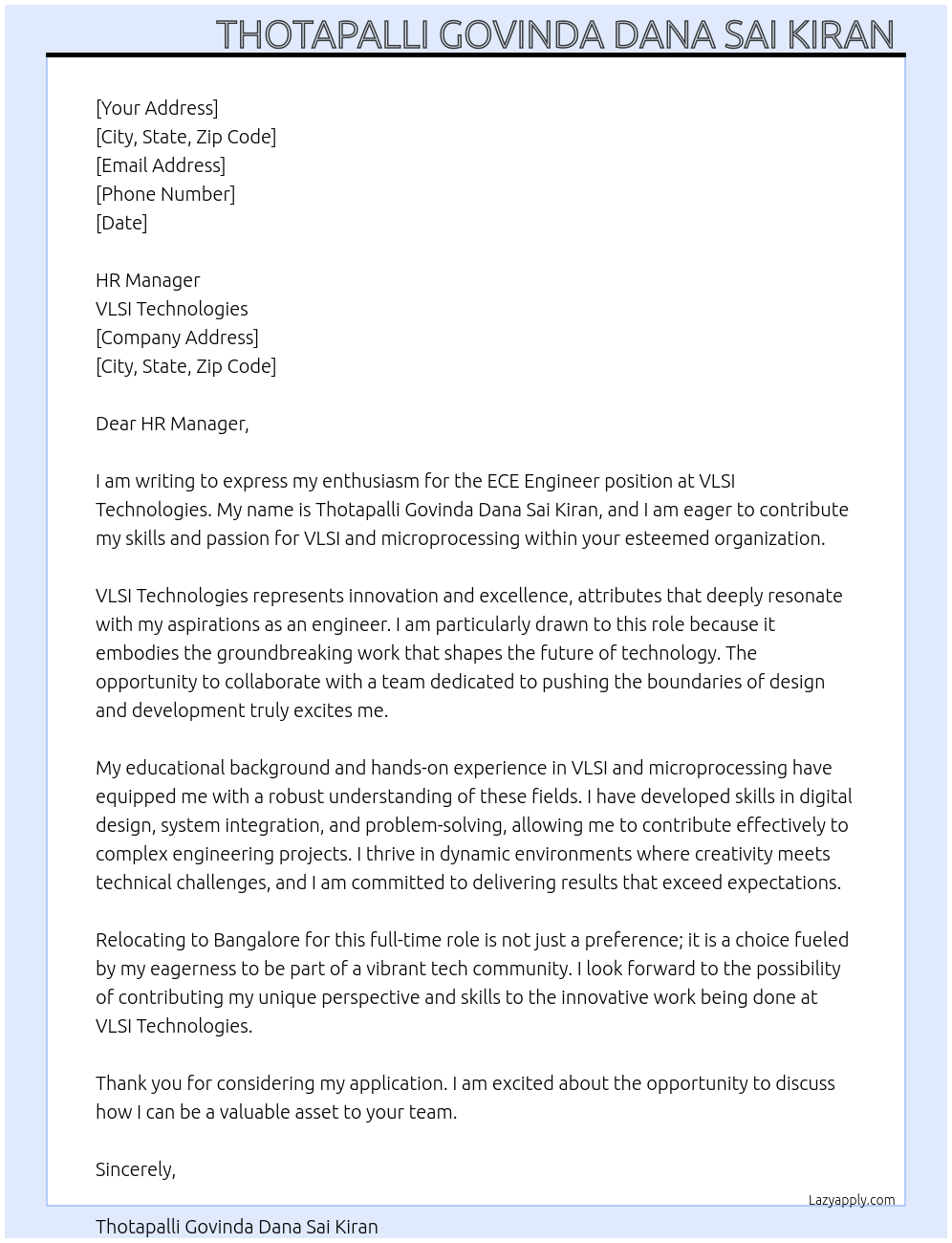 ECE ENGINEER Cover Letter At VLSI TECHNOLOGIES