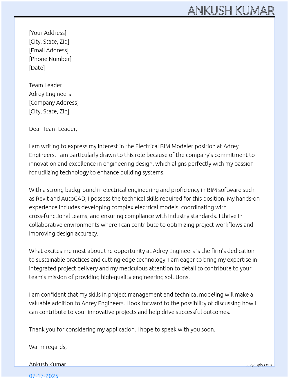 electrical bim modeler Cover Letter At adrey engineers
