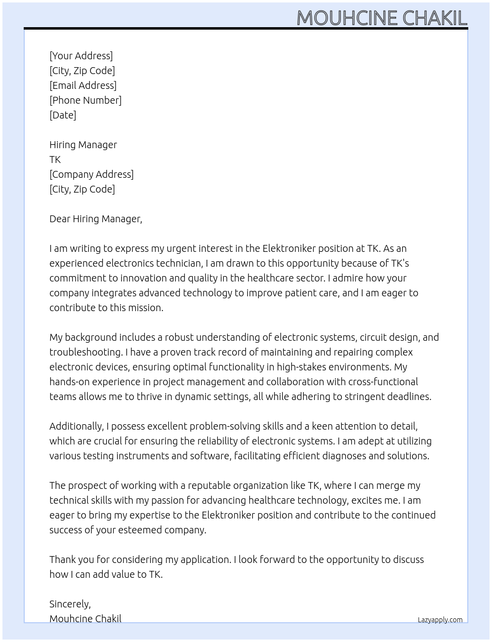 Check out these elektroniker cover letter sample and examples previously used by job seekers to land on job interviews as elektroniker. Use our AI cover letter generator to create a personalized cover letter as elektroniker.