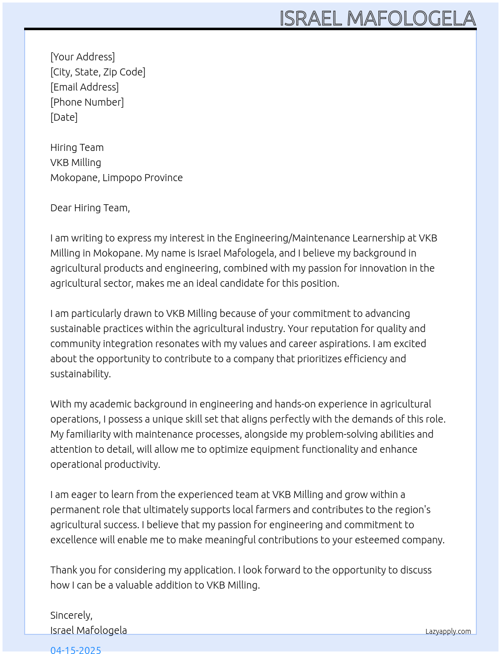 Engineering / Maintenance Leanership Cover Letter Examples And Template
