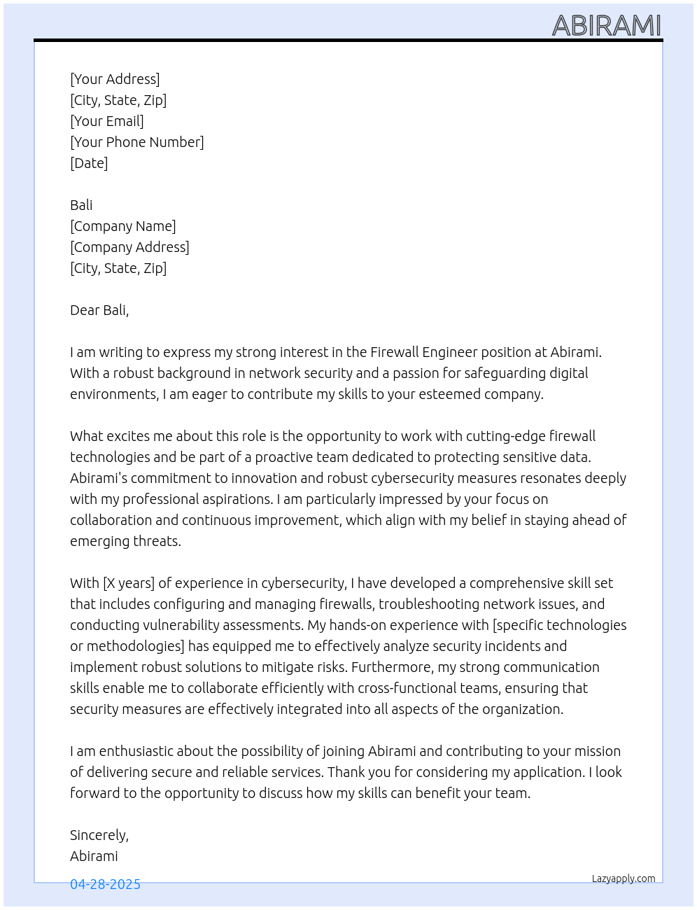 Check out these firewall engineer cover letter sample and examples previously used by job seekers to land on job interviews as firewall engineer. Use our AI cover letter generator to create a personalized cover letter as firewall engineer.