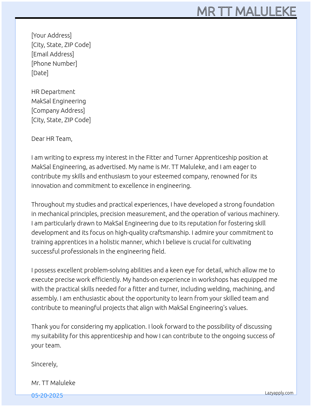 Fitter and turner apprenticeship Cover Letter At MakSal Engineering