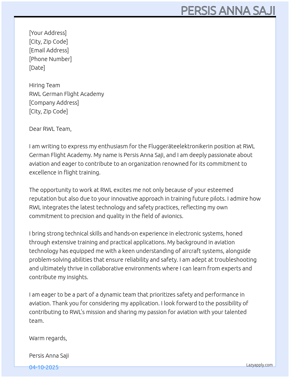 Fluggeräteelektronikerin Cover Letter At RWL german flight academy