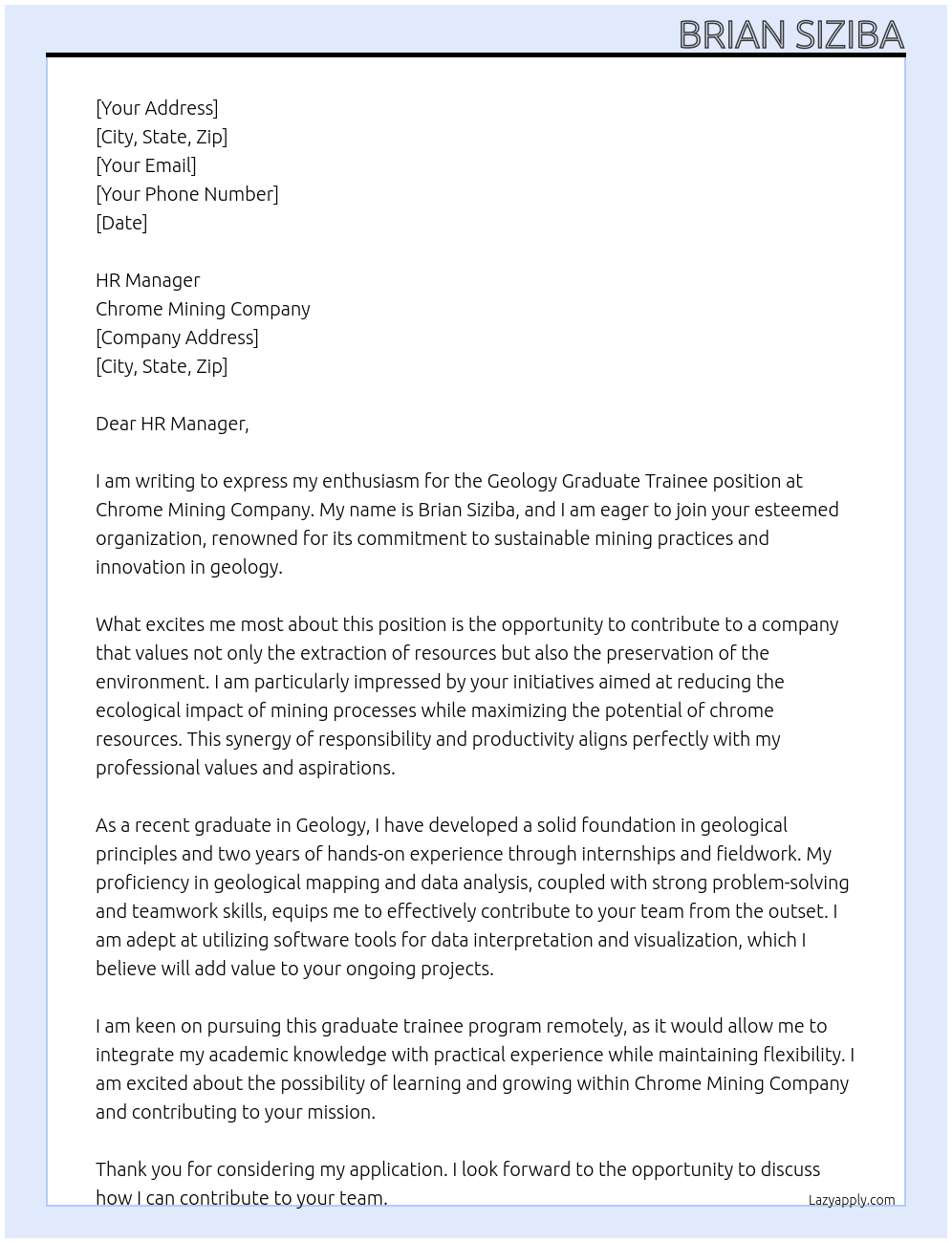 Geology Graduate Trainee Cover Letter At Chrome mining company