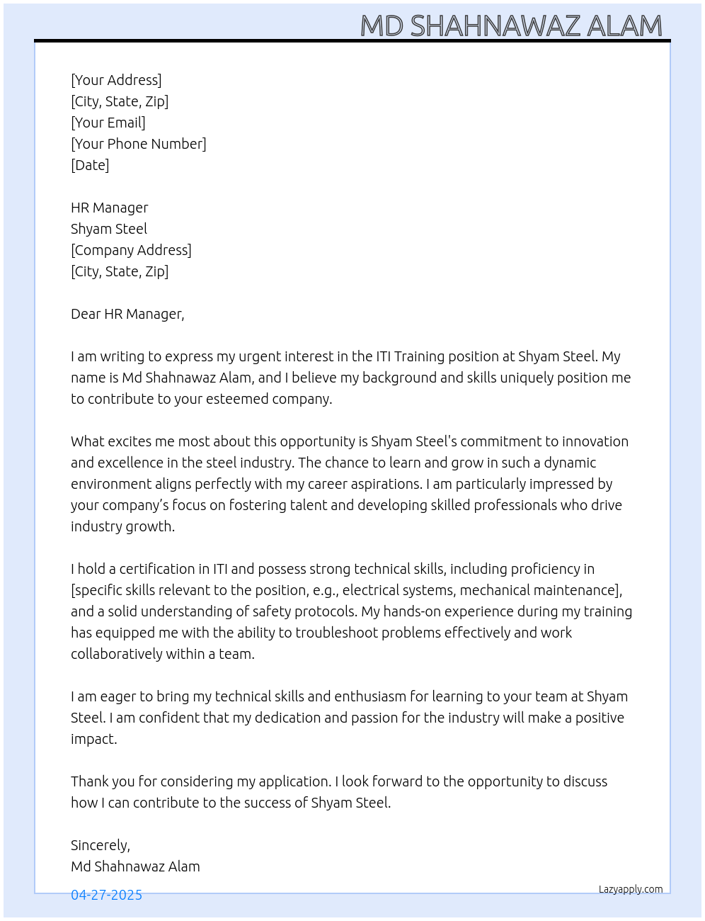 Check out these iti training cover letter sample and examples previously used by job seekers to land on job interviews as iti training. Use our AI cover letter generator to create a personalized cover letter as iti training.