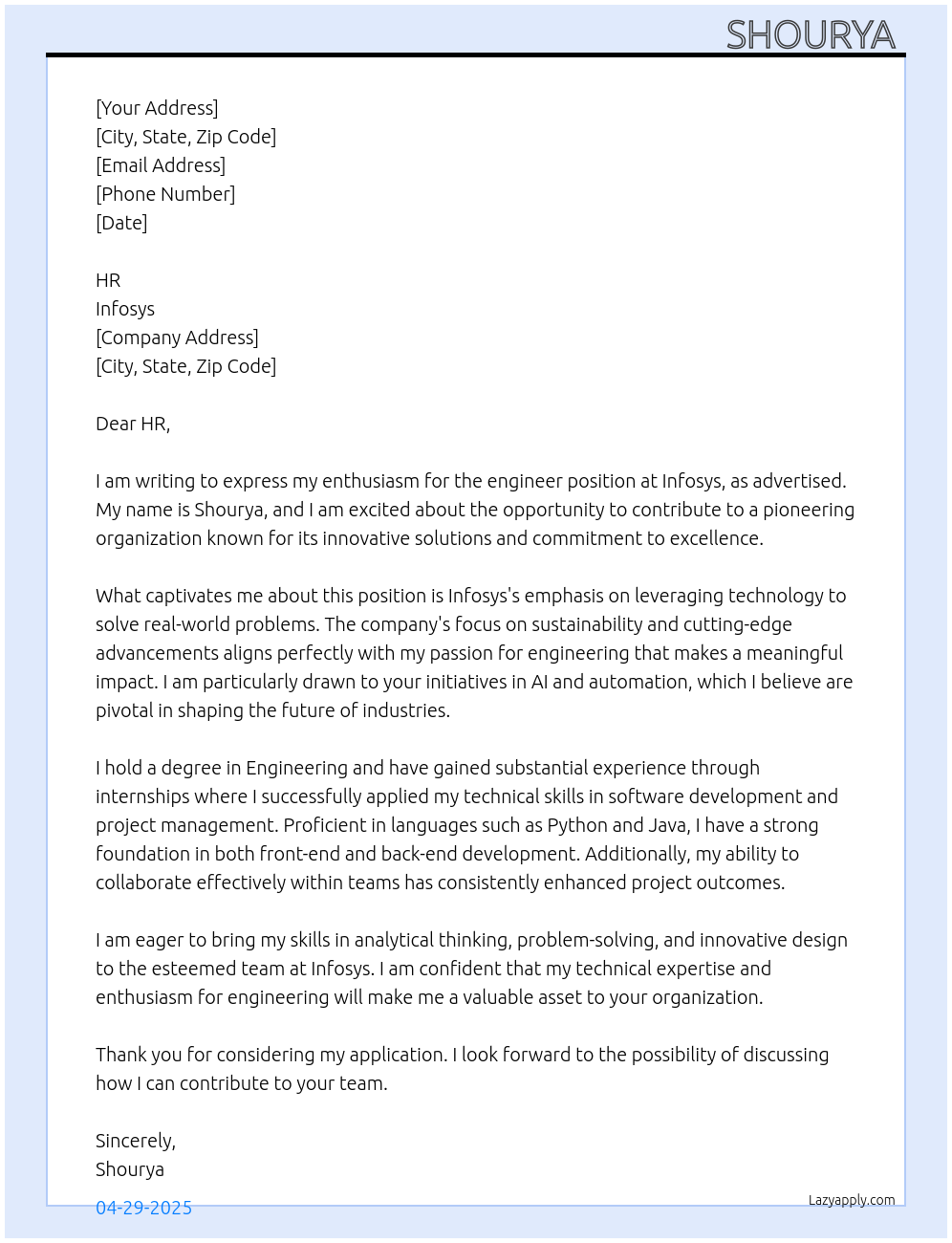 Check out these job application for the post of an engineer cover letter sample and examples previously used by job seekers to land on job interviews as job application for the post of an engineer. Use our AI cover letter generator to create a personalized cover letter as job application for the post of an engineer.