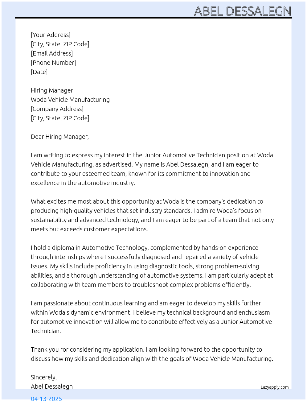 Junior automotive technician Cover Letter At Woda vehicle manufacturing