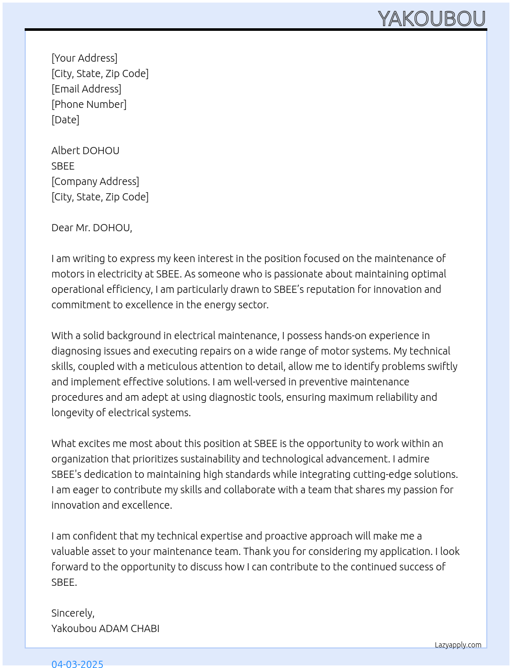Maintenance Of Motor In Electricity Cover Letter Examples