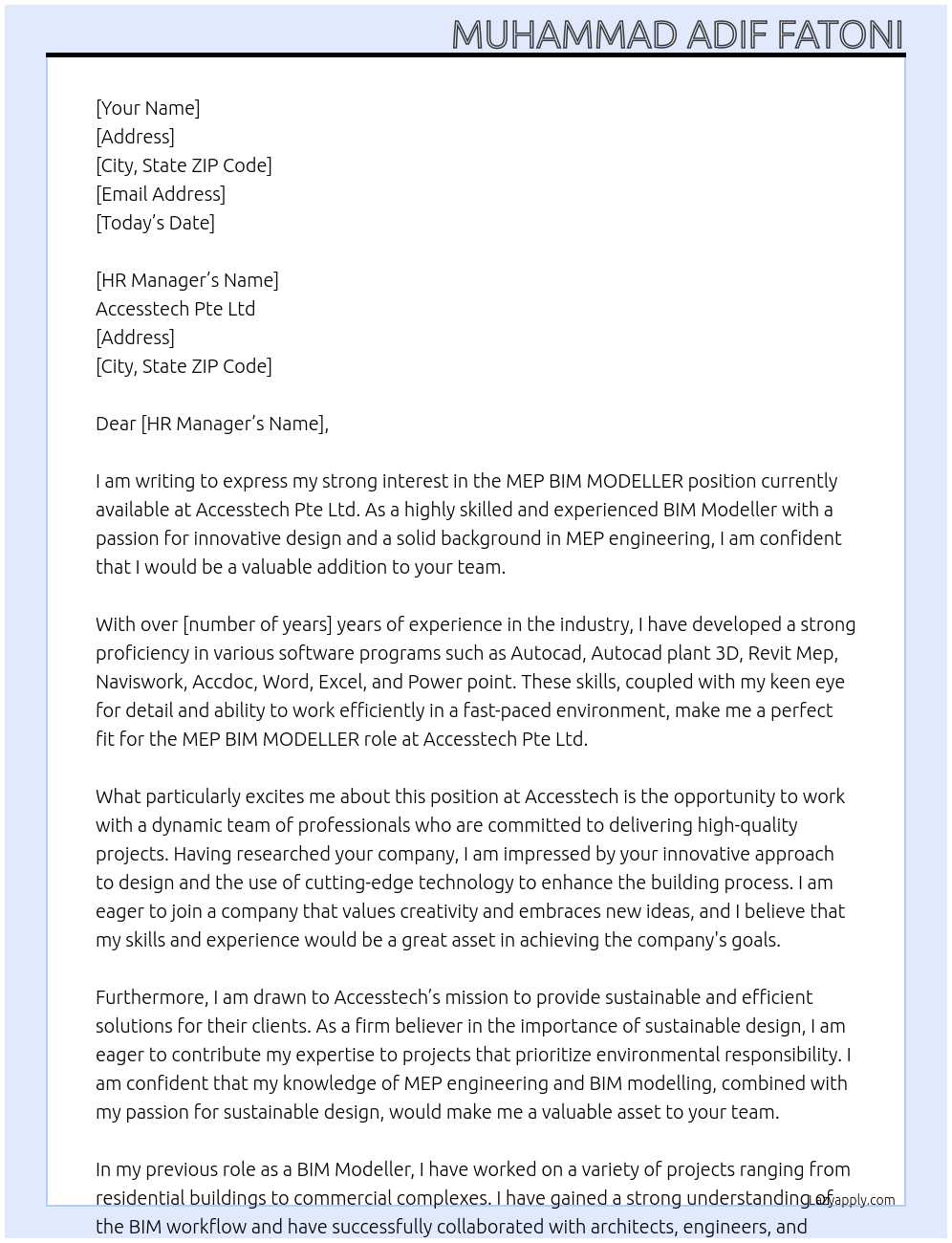 MEP BIM MODELLER Cover Letter At Accesstech Pte Ltd