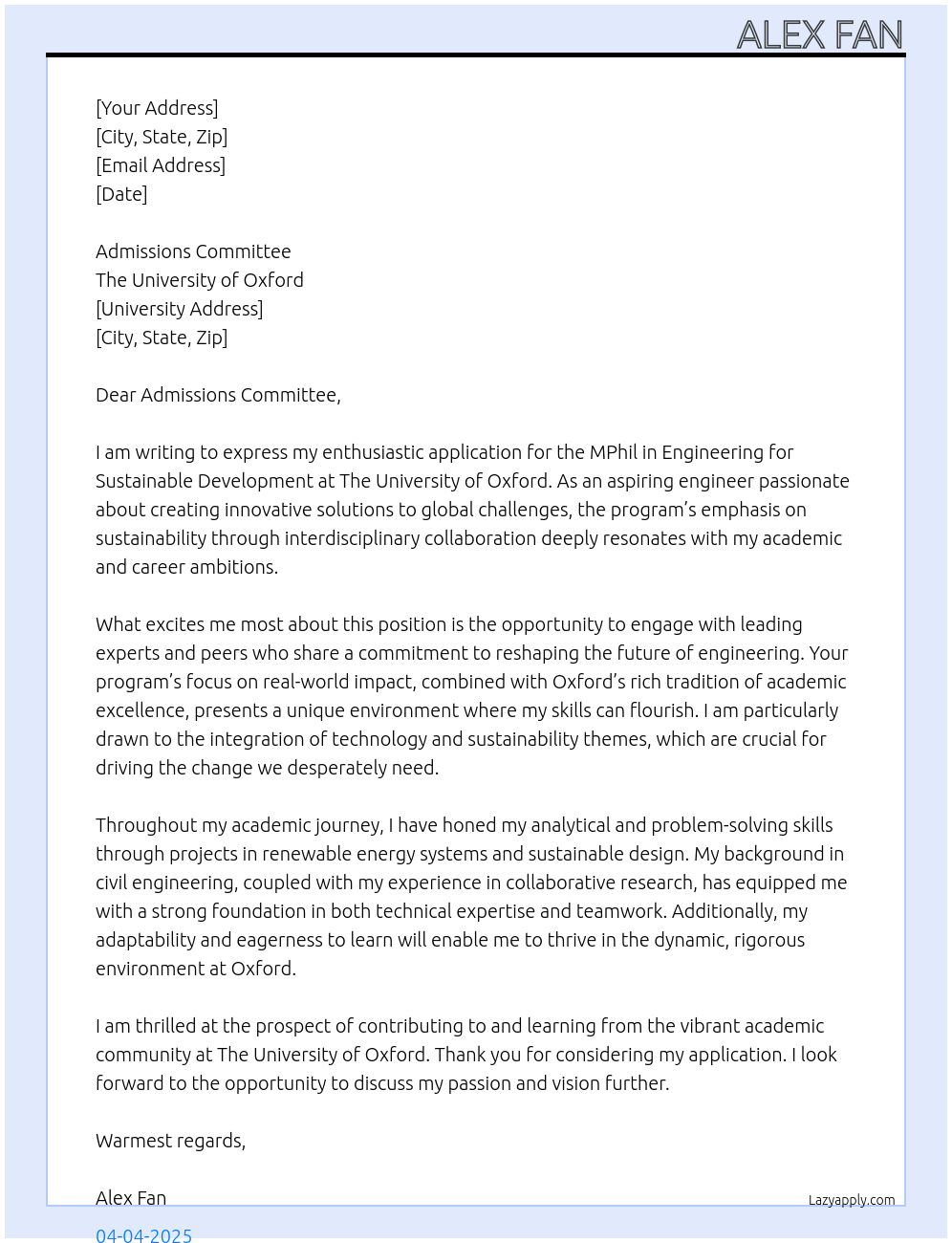 MPhil in Engineering for Sustainable Development Cover Letter At The University of Oxford