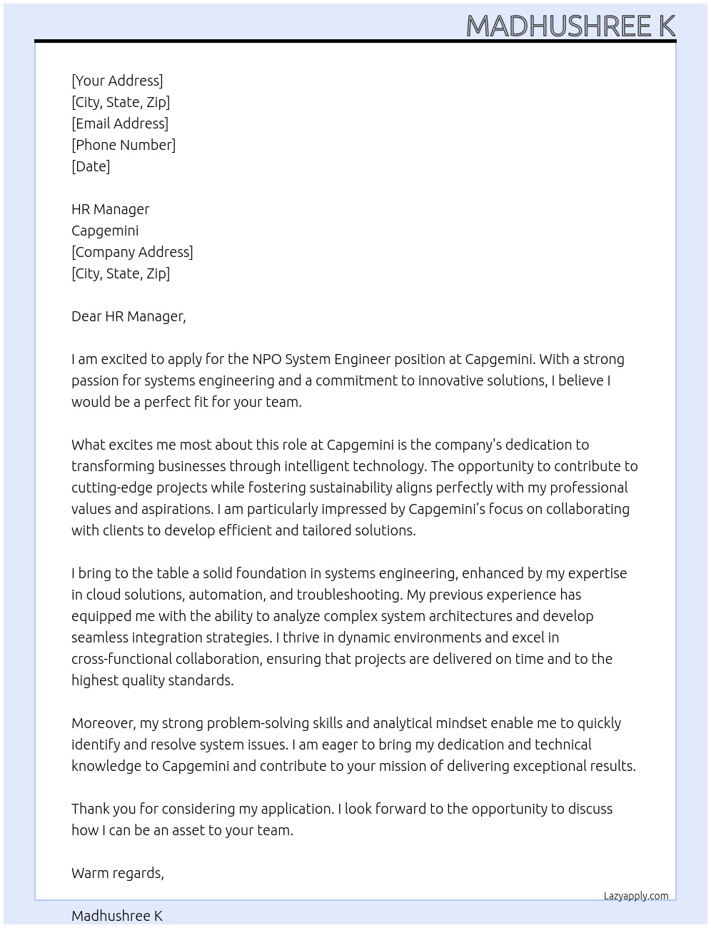 Check out these npo system engineer cover letter sample and examples previously used by job seekers to land on job interviews as npo system engineer. Use our AI cover letter generator to create a personalized cover letter as npo system engineer.