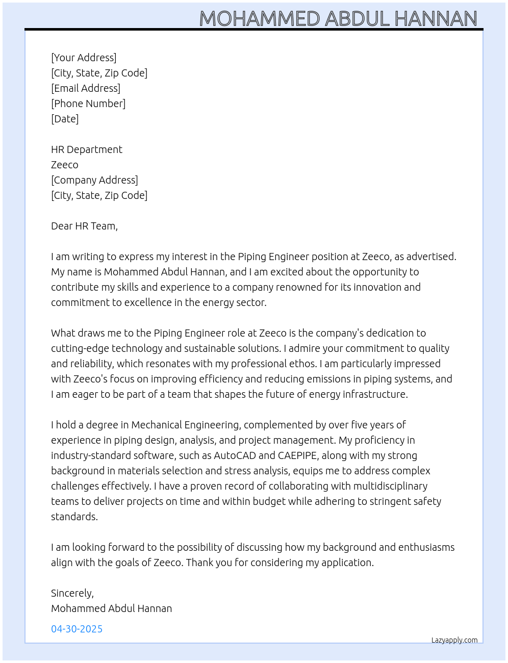 Check out these piping engineer cover letter sample and examples previously used by job seekers to land on job interviews as piping engineer. Use our AI cover letter generator to create a personalized cover letter as piping engineer.