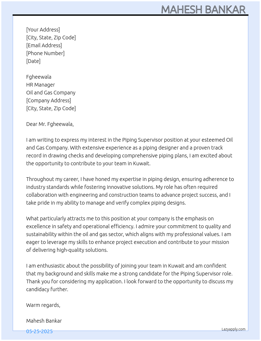 Piping Supervisor Cover Letter At Oil and gas company
