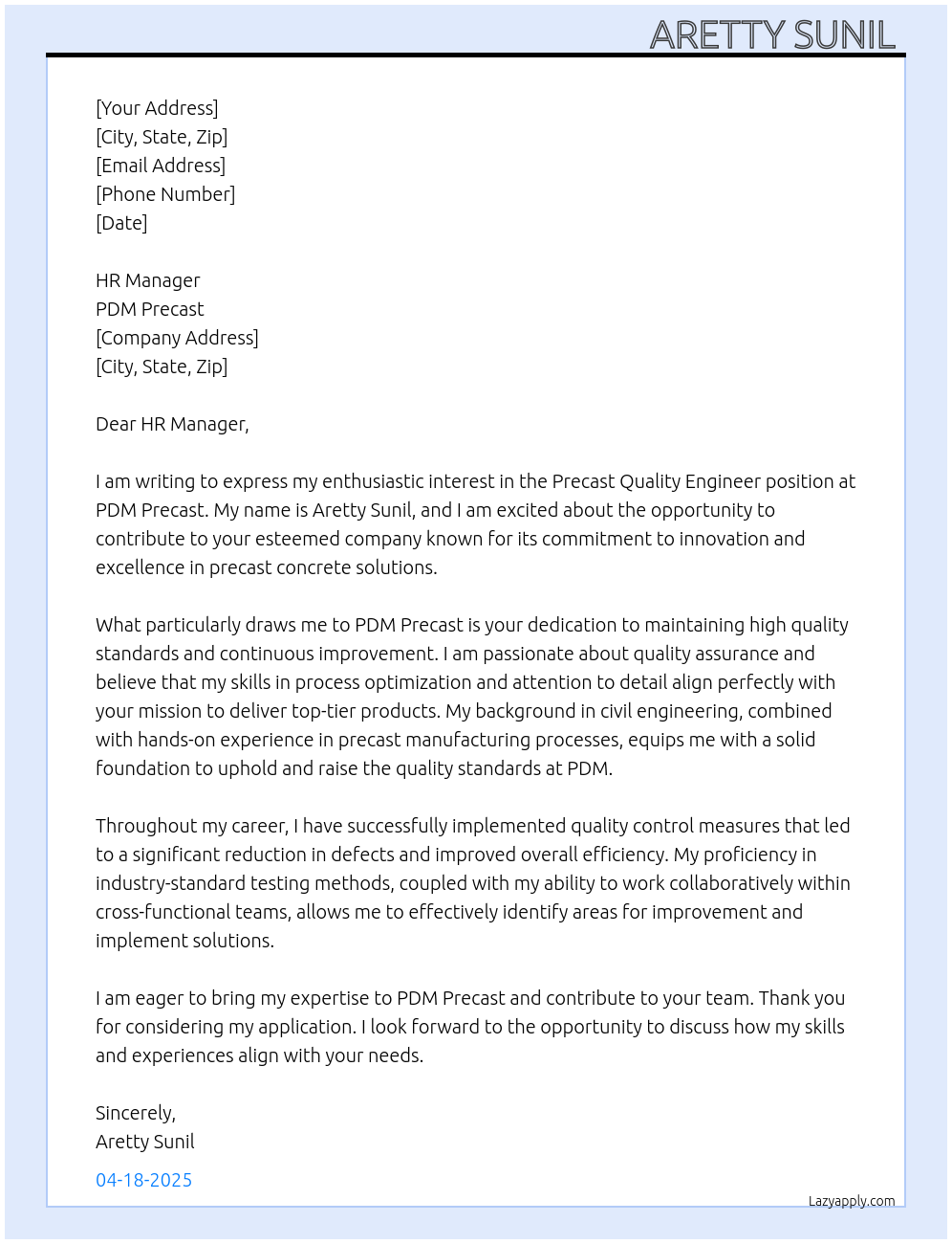 Check out these precast quality engineer cover letter sample and examples previously used by job seekers to land on job interviews as precast quality engineer. Use our AI cover letter generator to create a personalized cover letter as precast quality engineer.