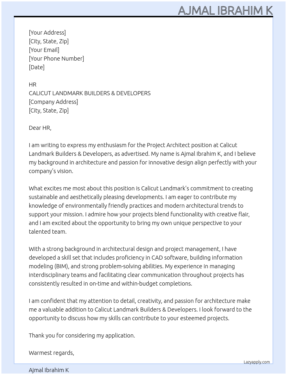 project architect Cover Letter At CALICUT LANDMARK BUILDERS & DEVELOPERS