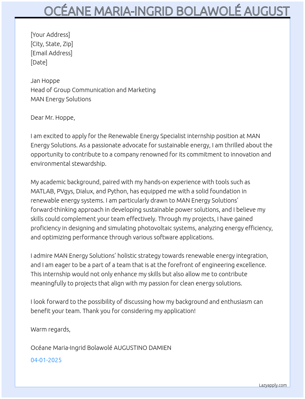 Renewable energy specialist Cover Letter At Man Energy Solutions
