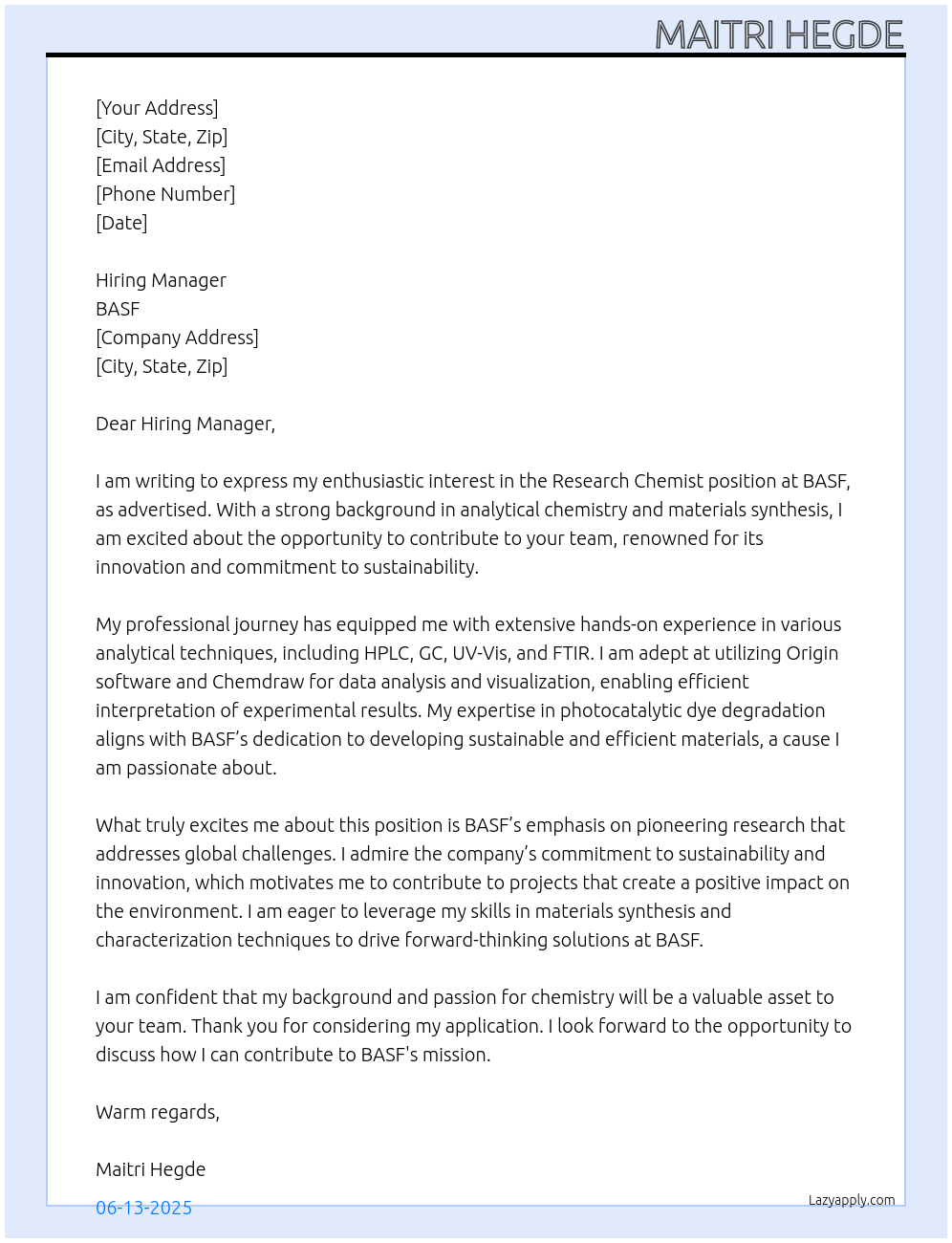 Check out these research chemist cover letter sample and examples previously used by job seekers to land on job interviews as research chemist. Use our AI cover letter generator to create a personalized cover letter as research chemist.