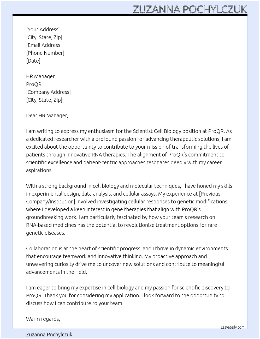 Check out these scientist cell biology cover letter sample and examples previously used by job seekers to land on job interviews as scientist cell biology. Use our AI cover letter generator to create a personalized cover letter as scientist cell biology.