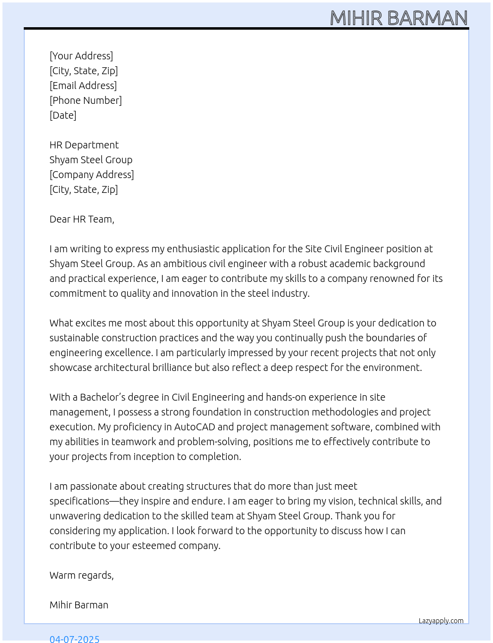 Check out these site civil engineer cover letter sample and examples previously used by job seekers to land on job interviews as site civil engineer. Use our AI cover letter generator to create a personalized cover letter as site civil engineer.