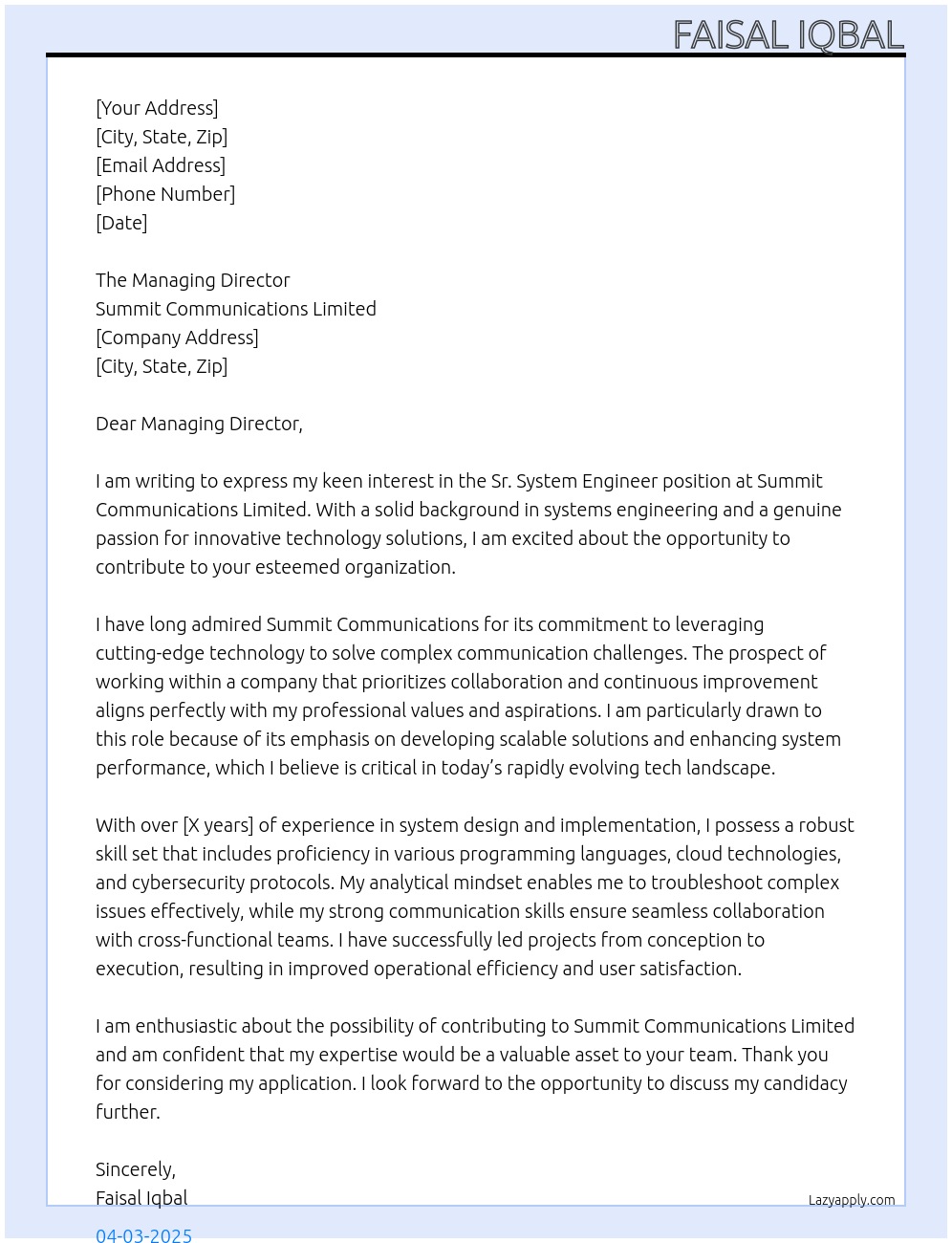 Sr. System Engineer Cover Letter At Summit Communications Limited