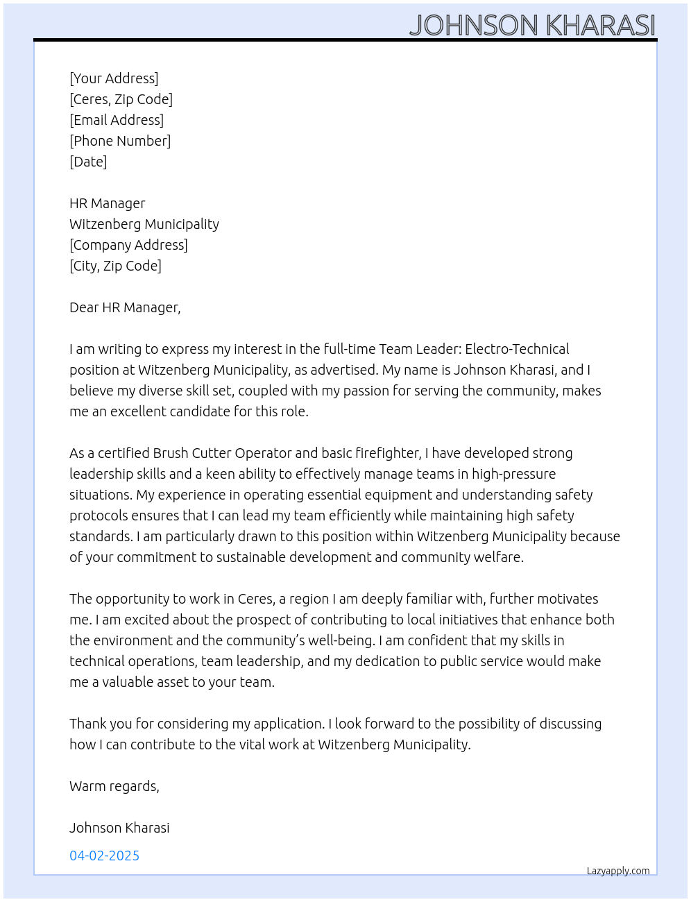 Team Leader: Electro- technical Cover Letter At Witzenberg Municipality